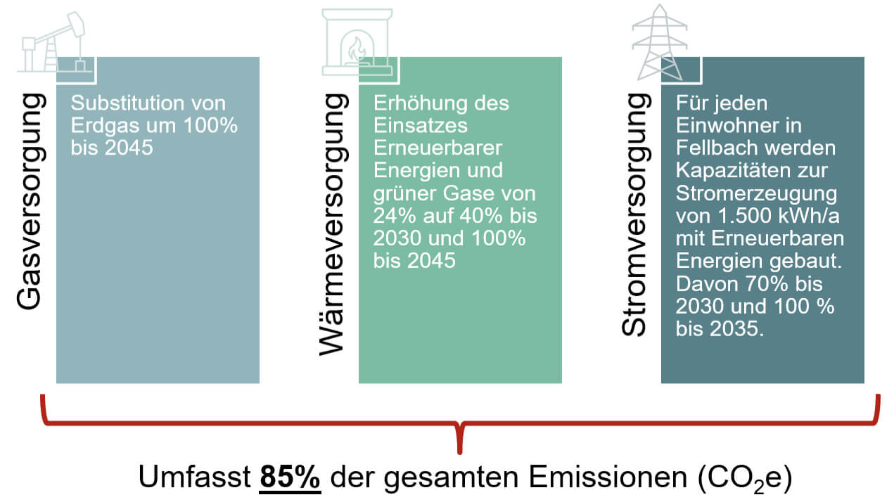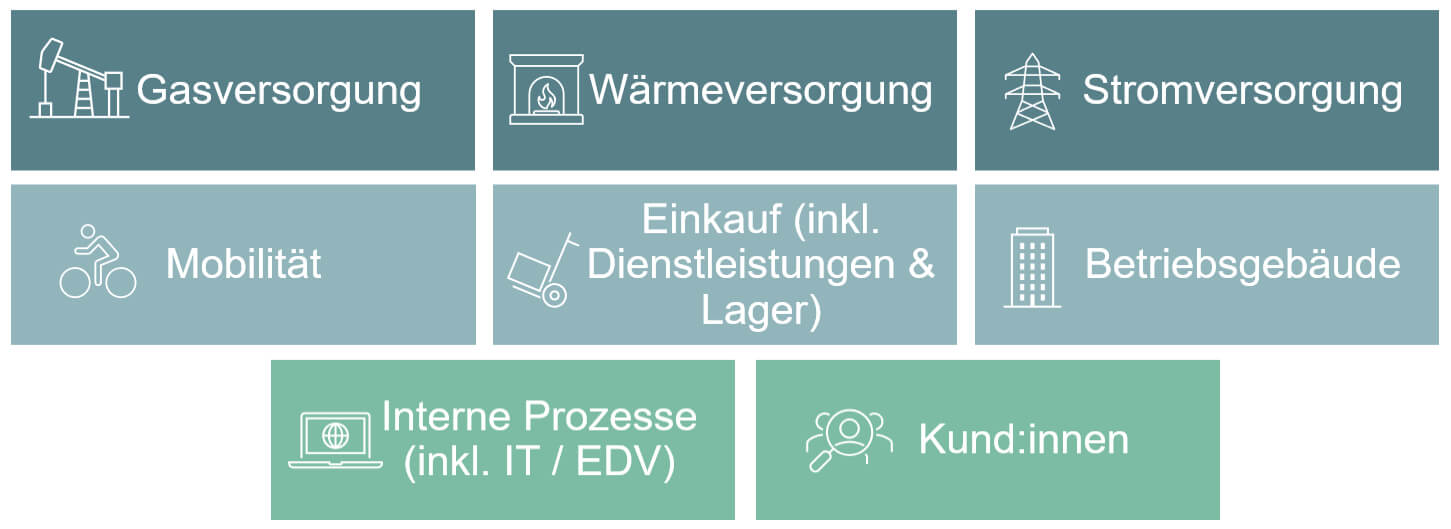 Stand heute kann noch nicht für jedes Handlungsfeld ein Ziel benannt werden. Die drei wichtigsten Handlungsfelder sind die Gas-, Wärme- und Stromversorgung. Mehr als 85 % der Treibhausgasemissionen entstehen in diesen drei Handlungsfeldern. Deswegen schlägt die Geschäftsführung in einem ersten Schritt die folgenden Handlungsfeldziele für diese Handlungsfelder vor: