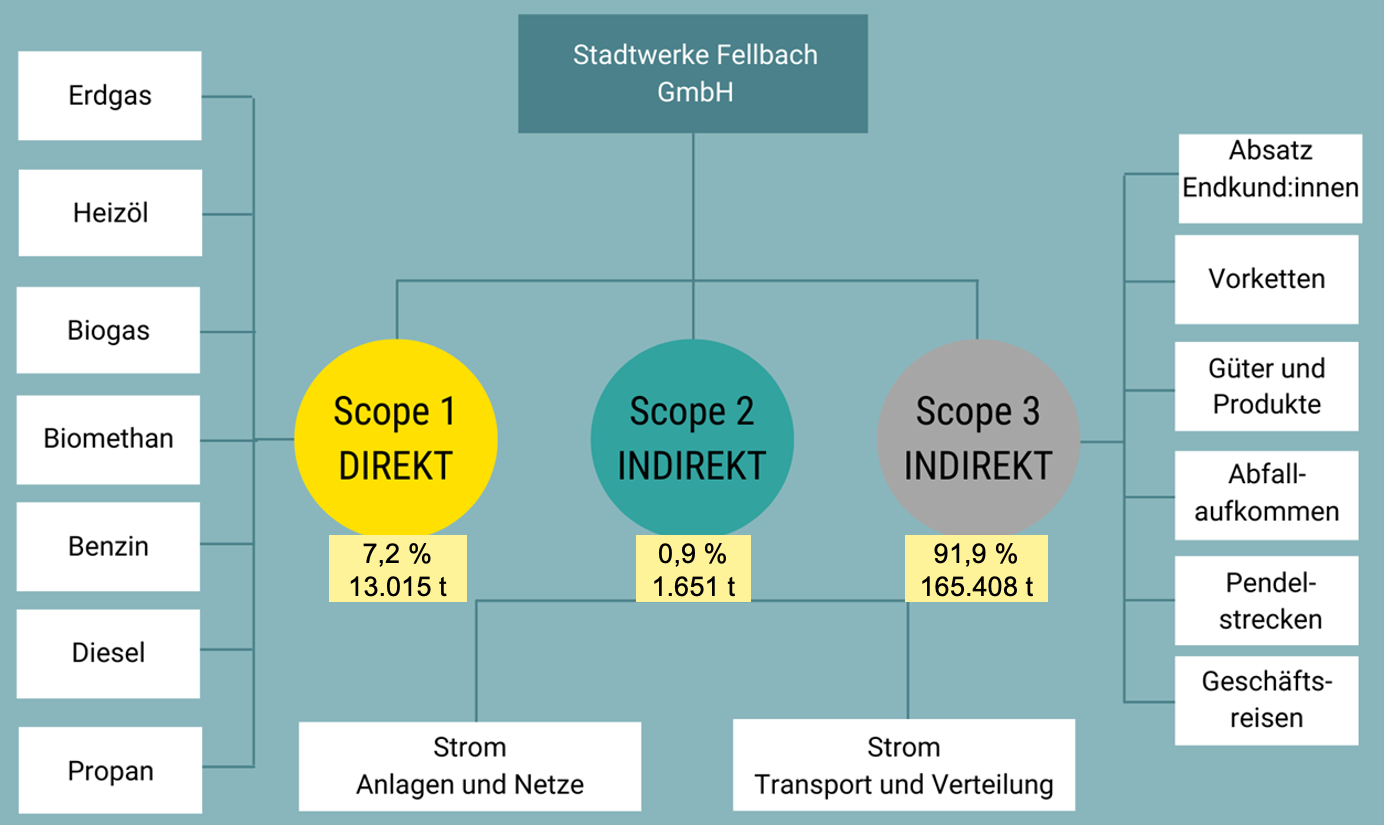 Die Treibhausgasbilanz der Stadtwerke wurde nach dem weltweiten Standard „Green-House-Gas Protocol“ erstellt. Dabei wurde nicht nur CO2, sondern eine Vielzahl relevanter Treibhausgase berücksichtigt. Die Bilanz bezieht sich sowohl auf selbst kontrollierte direkte Emissionen (Scope 1), zugekaufte indirekt genutzte Energie (Scope 2) als auch auf zugelieferte Emissionen (Scope 3). Die Treibhausgasbilanz enthält alle Emissionen der Stadtwerke Fellbach. Die Ausgangsdaten für die Erstellung der Treibhausgasemission beruhten auf dem Jahr 2019, damit coronabedingte Effekte das Ergebnis nicht verzerren. Untenstehend ist bereits die Fortschreibung für das Jahr 2021 dargestellt.