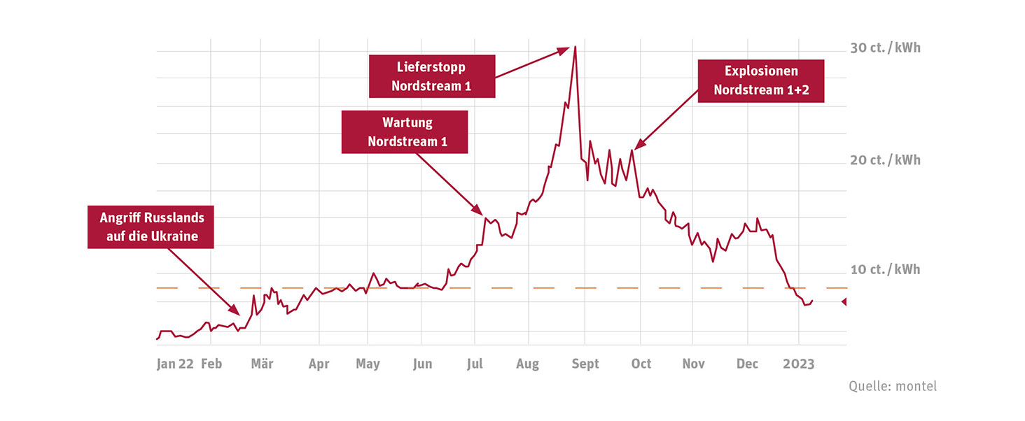 Seitdem gehen die Terminpreise wieder zurück, sind aber immer noch auf einem hohen Niveau. Der Angriffskrieg Russlands auf die Ukraine, die Angst vor Lieferstopps der Gaslieferungen aus Russland und einer Gasmangellage im Winter 2022/2023 sowie die Gaskäufe der THE zur Befüllung der Gasspeicher, haben zu einem nie dagewesenen Preisanstieg geführt. Für das Terminjahr 2023 wurden zeitweise Börsenpreise von bis zu 31 ct./kWh Erdgas und bis zu 99 ct./kWh Strom (Base) bzw. 130 ct./kWh Strom (Peak) gehandelt.